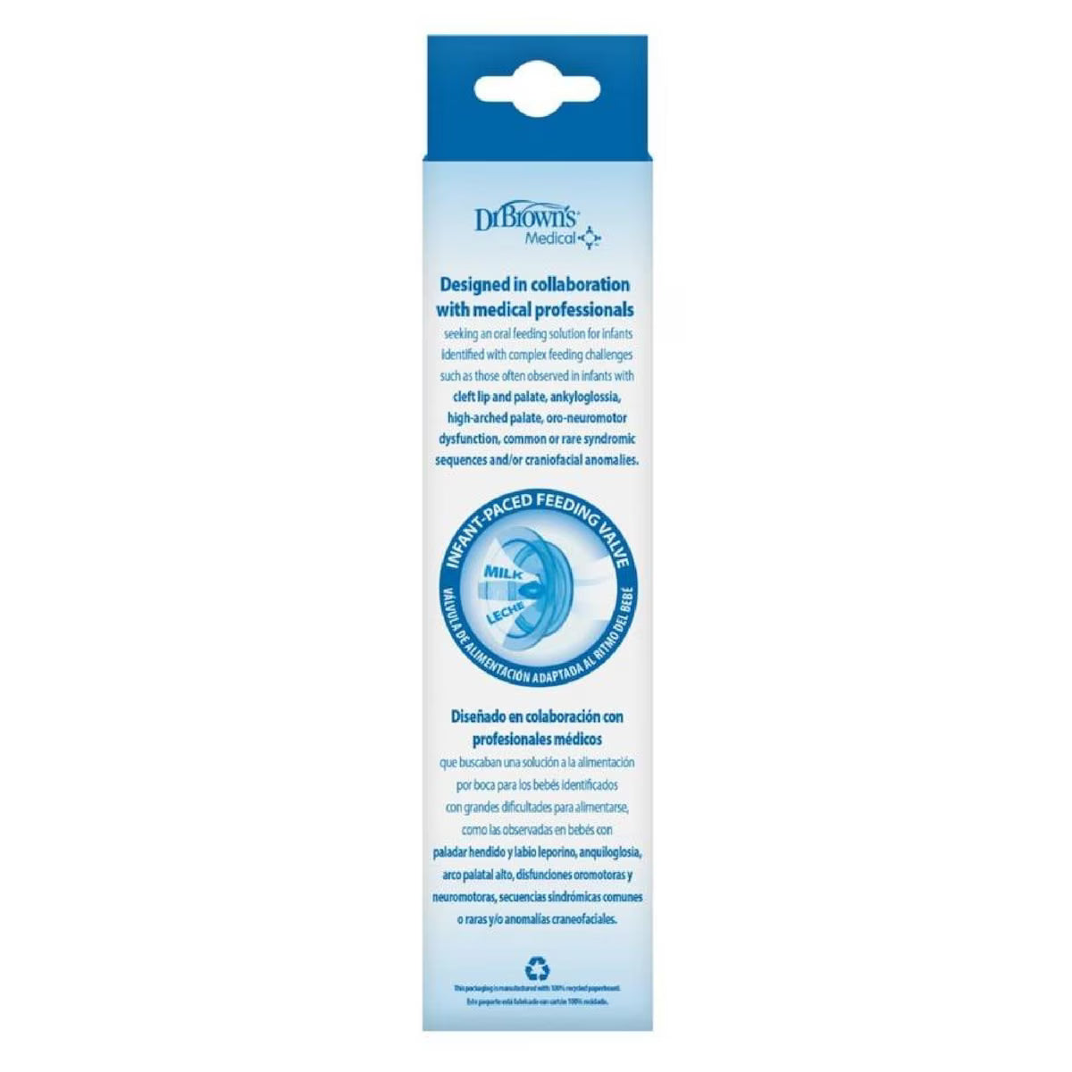 Babies with conditions that may cause difficulty feeding include cleft lip/palate, tongue tie, lip tie, oro-neuromotor dysfunctions, congenital heart disease, or craniofacial anomalies. The included Infant Paced Feeding Valve is inserted into Dr. Brown's standard silicone nipple to create a compression nipple.