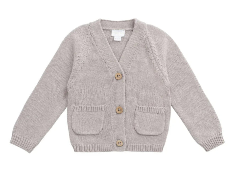 The Franco Cardigan in Moleskin Marle is a beautifully soft and breathable knit, perfect for layering on cooler days. Crafted in a light grey marled cotton, this cardigan features a classic V-neckline, three coconut buttons down the front, and two sweet pockets—ideal for tiny treasures or chilly hands.