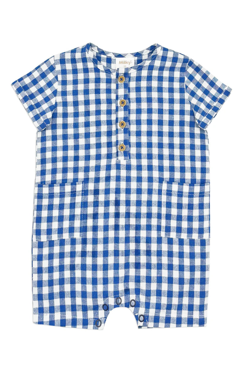 Milky Clothing Check Romper is a charming summer essential, made from soft, breathable cotton blend for ultimate comfort during warm weather outings. Designed to be gender-neutral, this versatile romper features convenient snaps at the crotch and buttons at the front for easy dressing and quick changes. With its timeless design and eye-catching check pattern, this romper is sure to turn heads and earn compliments every time it's worn.