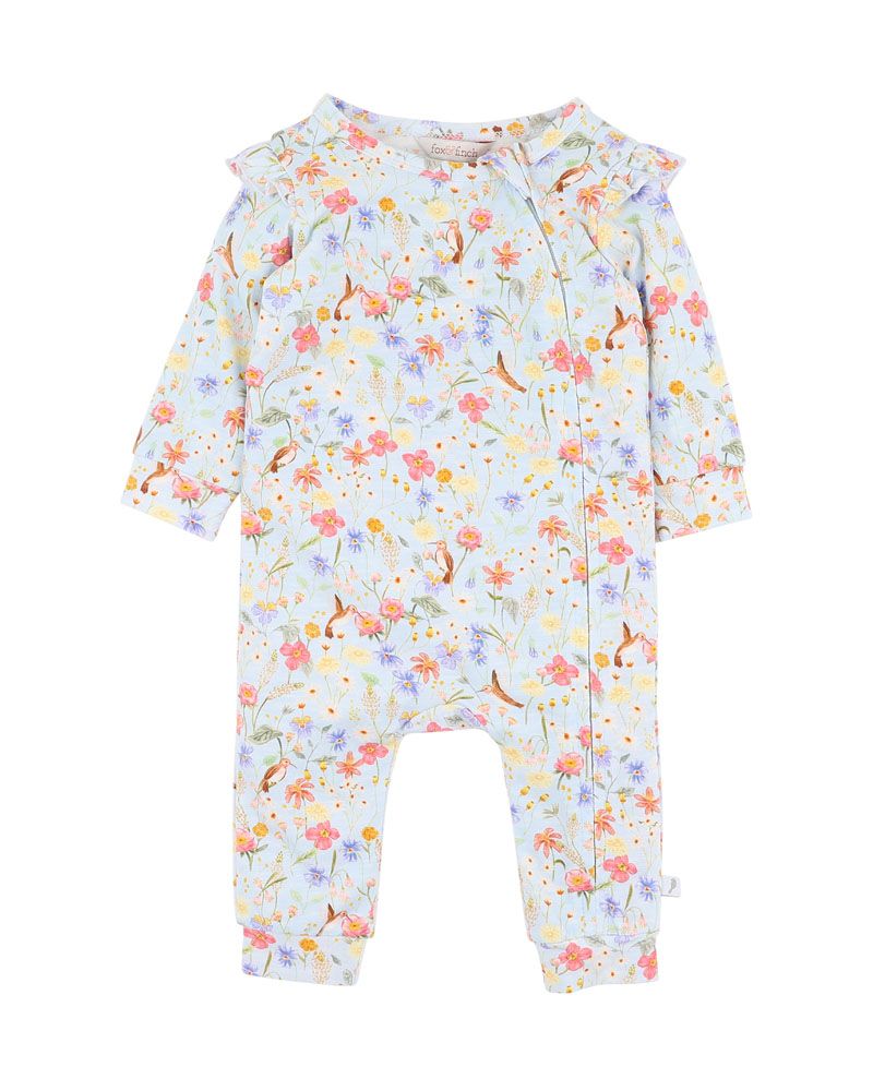 A peaceful field of wildflowers and songbirds brings a calming charm to this all-over printed zip suit. Soft and breathable with a gentle stretch, it's perfect for lounging, crawling, and cuddles. Frill shoulders add a sweet finish while practical touches make dressing a breeze.