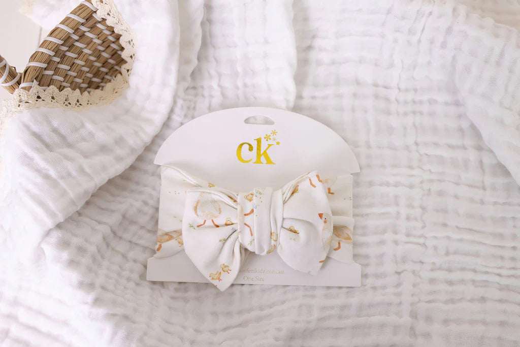 Our beautiful oversized pre-tied bow in our gender neutral "Puddleduck" print is the perfect finishing touch to pair with our coordinating zipsuit. These come beautifully presented in gift-ready packaging.