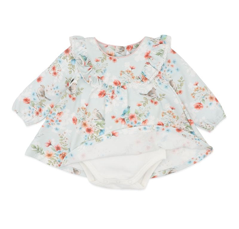 Soft, romantic and thoughtfully designed, this beautiful floral overlay dress brings an extra touch of charm to everyday dressing. Crafted from organic cotton jersey with just the right amount of stretch, the delicate floral print drapes gently over an attached bodysuit for a look that feels special yet practical. Sweet ruffle detailing and a softly shaped neckline add heirloom appeal, while the built-in bodysuit keeps little ones comfortable, secure and ready for cuddles, crawls and first adventures.