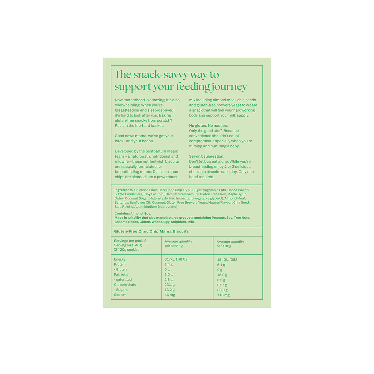 Our delicious gluten free choc chip cookies are nutrient-rich, specially crafted to help boost and support milk supply for breastfeeding and pumping mums.