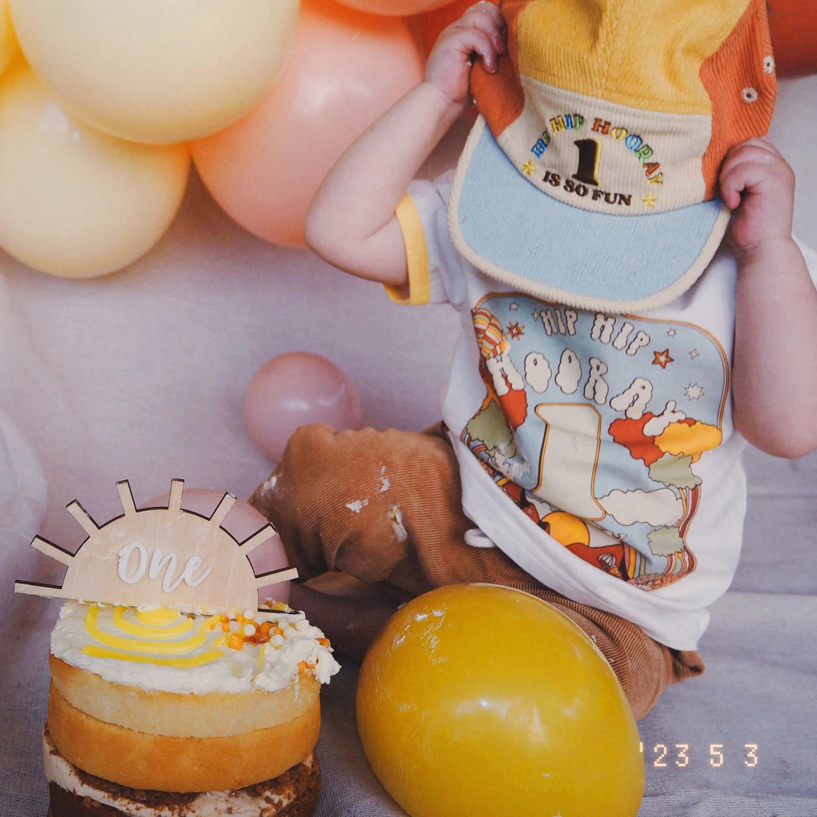 This organic cotton ringer tee features sunny yellow contrast binds and print that celebrates their first lap around the sun. Made to be worn on their big day and the whole year round.