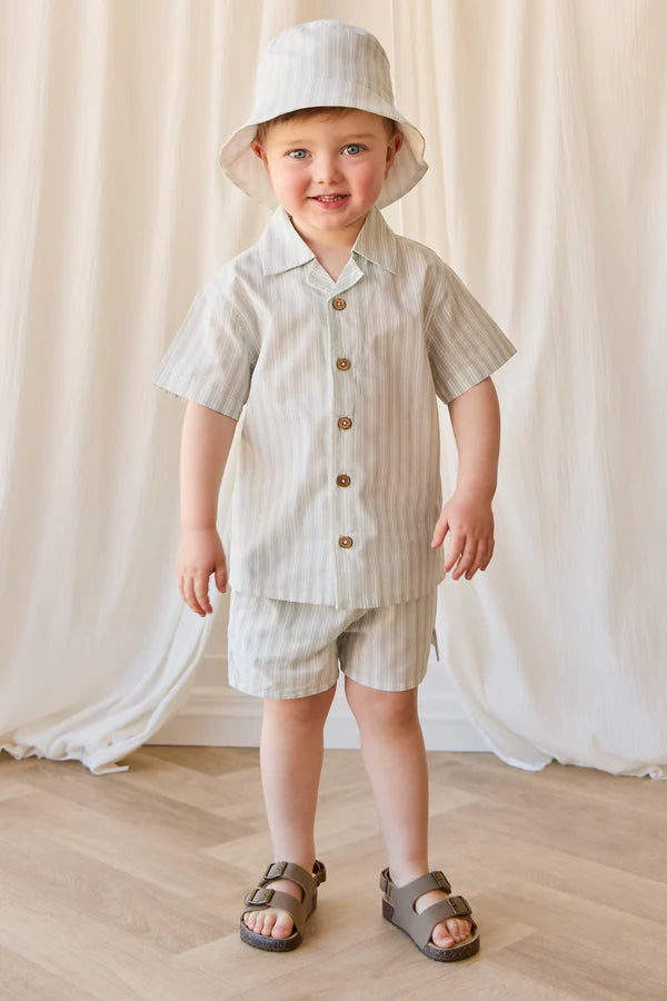 The Organic Cotton Silas Shirt – Variegated Stripe Shoreline is a timeless staple, crafted for comfort and style. Featuring a soft vertical stripe pattern in neutral shoreline tones, this short-sleeved button-up shirt is perfect for layering or wearing on its own — a versatile piece for every season.