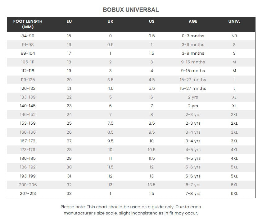 At Bobux, we use European sizing. How this converts to other international sizing is shown in the graph below.  Australia kids shoe sizes are same as UK sizing.