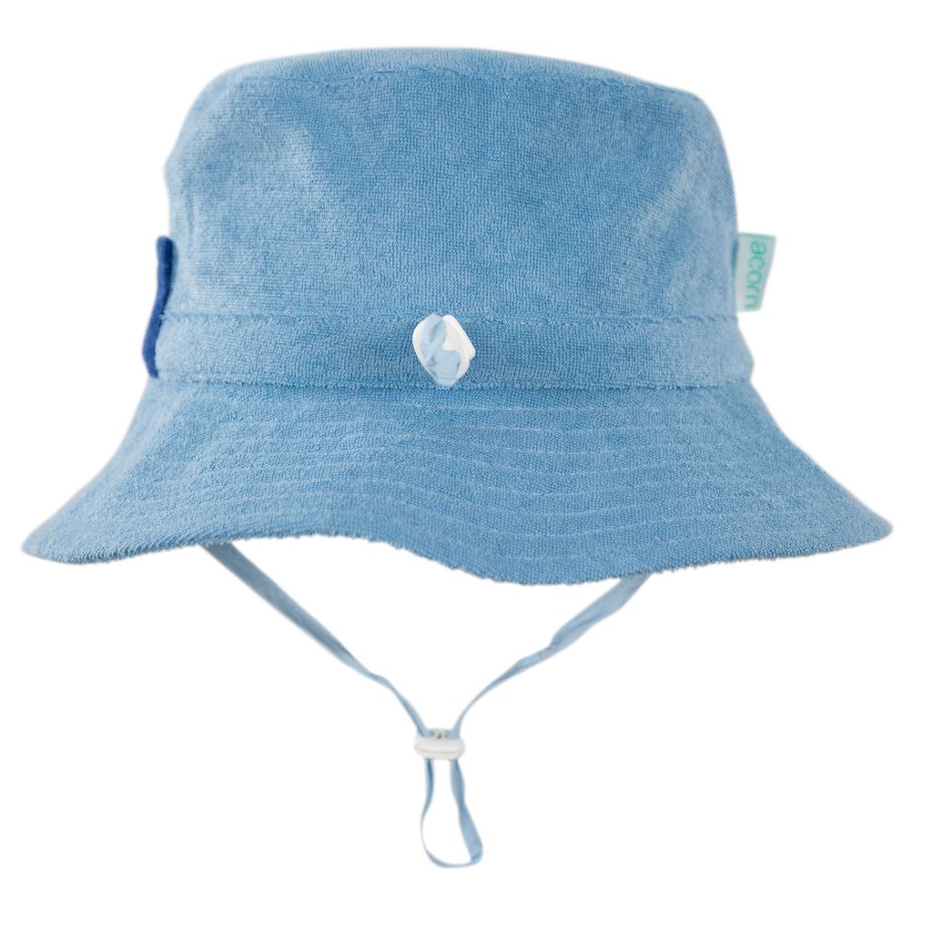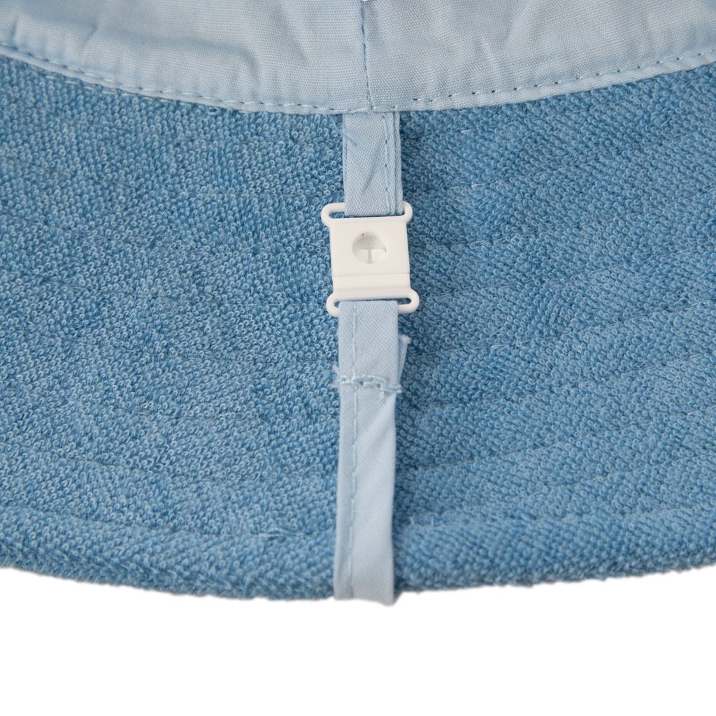 A fun terry towelling bucket hat in a light blue colour with a mid blue contrast pocket on the side is giving all the cool retro vibes this summer.